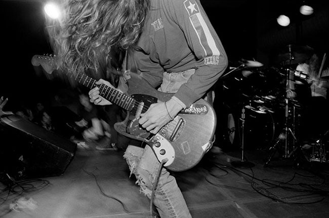 Photographer Charles Peterson: “Everything just came together, partly because the club was so small and the crowd so enthusiastic and I was just on. I got some really amazing photos. The woman on the far left who has hair in her face, that’s actually Donita Sparks from the band L7. Kurt is throwing himself back and forth and [Sparks’ friend’s] finger is inches away from his face. When you can incorporate the audience into [a shot], it tells that much more of the story. Sometimes you go someplace and people just stand around. I think it was the L7 girls that were really inspirational that night. Sometimes it just takes a few people from the crowd to make it come together.”
